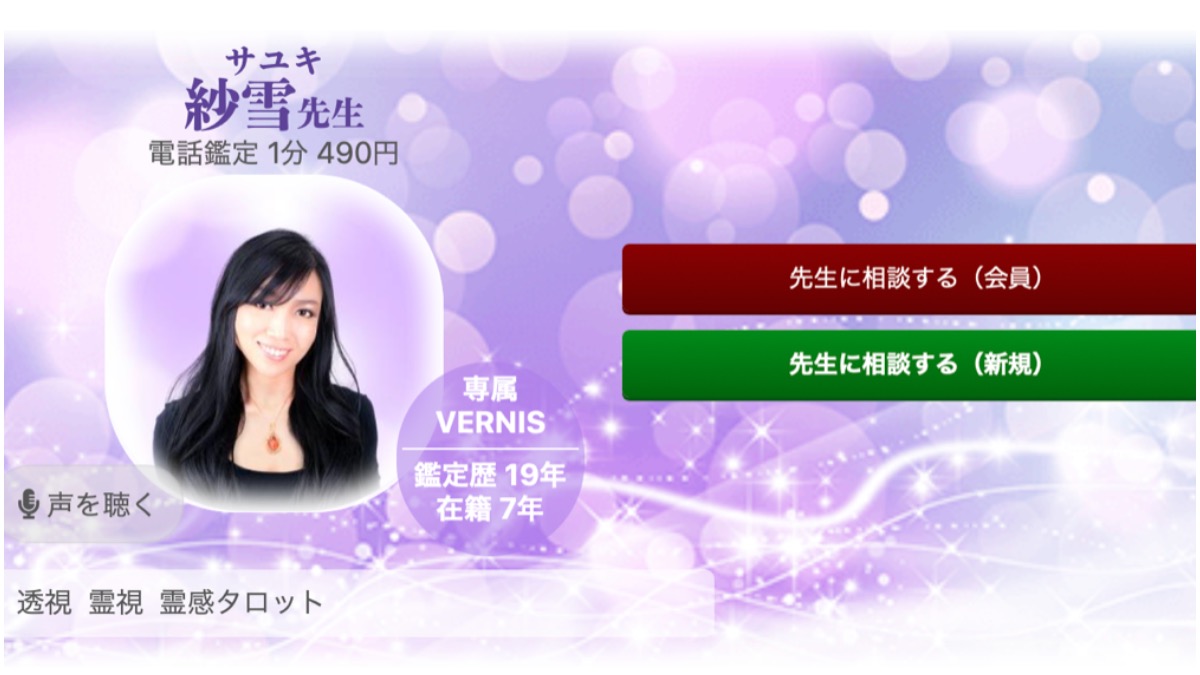 電話占い ヴェルニ】は、老舗人気の電話占いサイトで占い師の在籍数も1000人を超えるほどいます。相談者の思いに寄り添い全身全霊で鑑定してくれる紗雪(さゆき)先生のご紹介です。いつも予約でいっぱいの人気の秘密は優しさと鋭い鑑定にあります。あなたも悩みの根元を見つける愛のある鑑定を受けてみませんか?