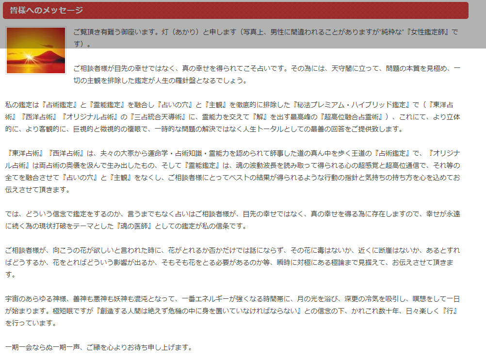 | 得意な相談内容 | 恋愛, 仕事, お金, 人間関係, 相性, 相手の気持ち, 縁結び, 浮気, 復縁, 略奪愛, 結婚, 不倫, 離婚, 縁切り, 家族問題, 健康, 近所問題, 仕事運, 転職, 起業, 職場問題, 金運, 就職, パワハラ, セクハラ, 人生全般, 浄霊, 霊障害 |