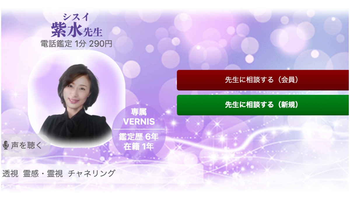 【電話占い ヴェルニ】は、老舗人気の電話占いサイトで占い師の在籍数も1000人を超えるほどいます。強い霊能力と丁寧な鑑定が口コミで広がった紫水(しすい)先生のご紹介です。夫婦カウンセラーも資格も持っているので、もつれて解けなくなってしまった夫婦問題も安心して相談できます。
