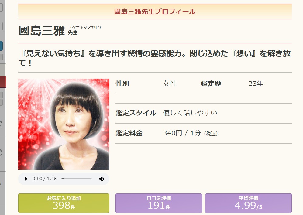 占い結果をはっきりと伝えるので、厳しいように感じる方もいるようですが、上げ下げのない裏にをしてくれるので信用できる占い師です。