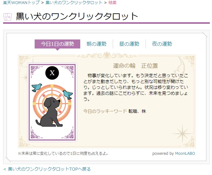 メニューバーの「ワンクリックタロット」を選ぶと、今日1日、朝、昼、夜と時間帯別のさらに細分化した運勢が占えます。