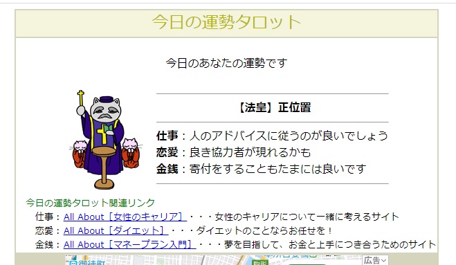 一部有料テーマも混在してますが、無料のものだけでも相当な数のメニューがあります。イエスノー占いのみならず、本当に数えきれないほどのテーマがあってびっくりです。タロット占いで勉強になることもたくさん出ているので、占いについて勉強したい人には特にオススメなイエスノー占いサイトです。タロット以外にも姓名判断やルーンもやっています。