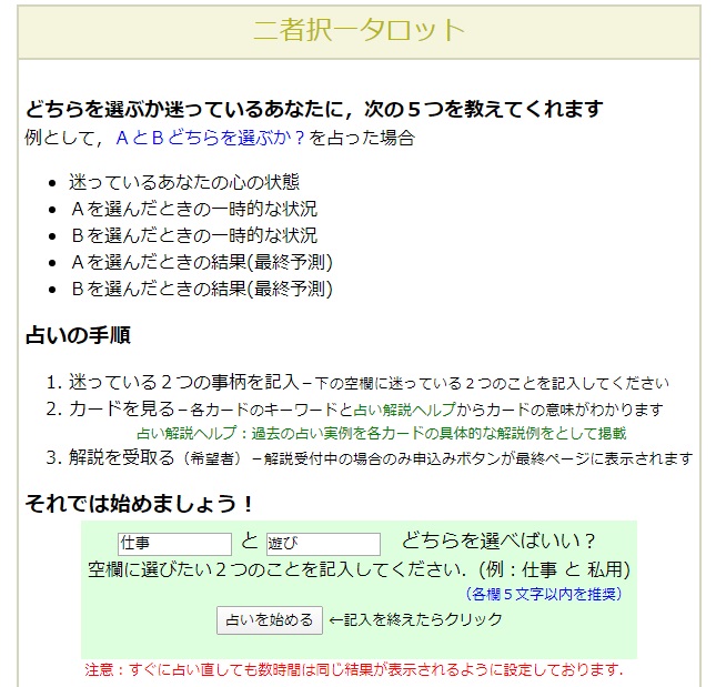 「二者択一タロット」の占い画面。「すぐに占い直しても数時間は同じ結果が出るように設定している」というところに、イカさんのセンスを感じさせます。