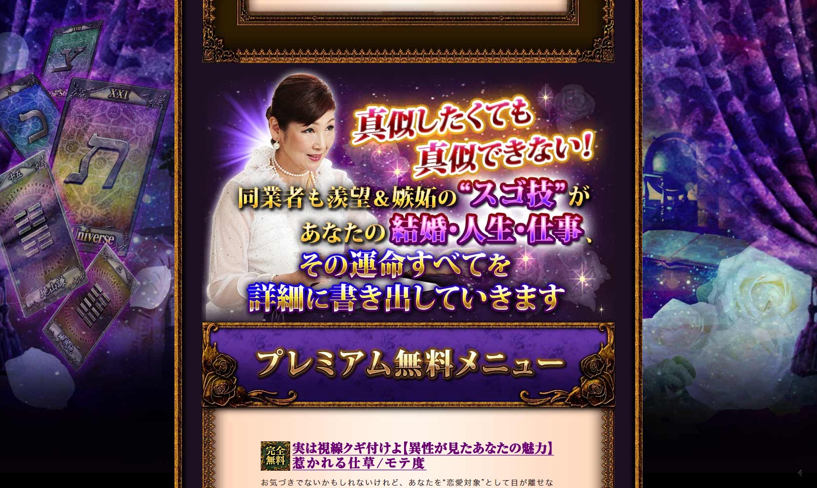 鑑定歴は、10年以上にわたり占術は、西洋占星術や直観タロットカード、エンジェルナンバー、イーチンタロット、インナーチャイルドカード、心理カード、手相、前世相性占いといった多数の占術を使い相談者へ寄り添い、悩み解決に向け一緒に向き合ってくれると評判となっています。特に恋愛に関する悩み相談を得意としていて相手の好みの女性のタイプや、相手を喜ばすことなどを読み取り、告白のタイミングを見計らいながら、アドバイス、サポートを行っています。