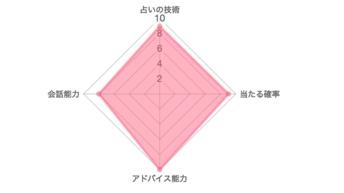 | 得意な相談内容 | 相性、結婚、離婚、 復活愛、 略奪愛 、不倫、 年の差、遠距離、 同性愛、三角関係、金運、仕事、対人関係、家庭問題、開運方法 、 子育て、運勢、 |